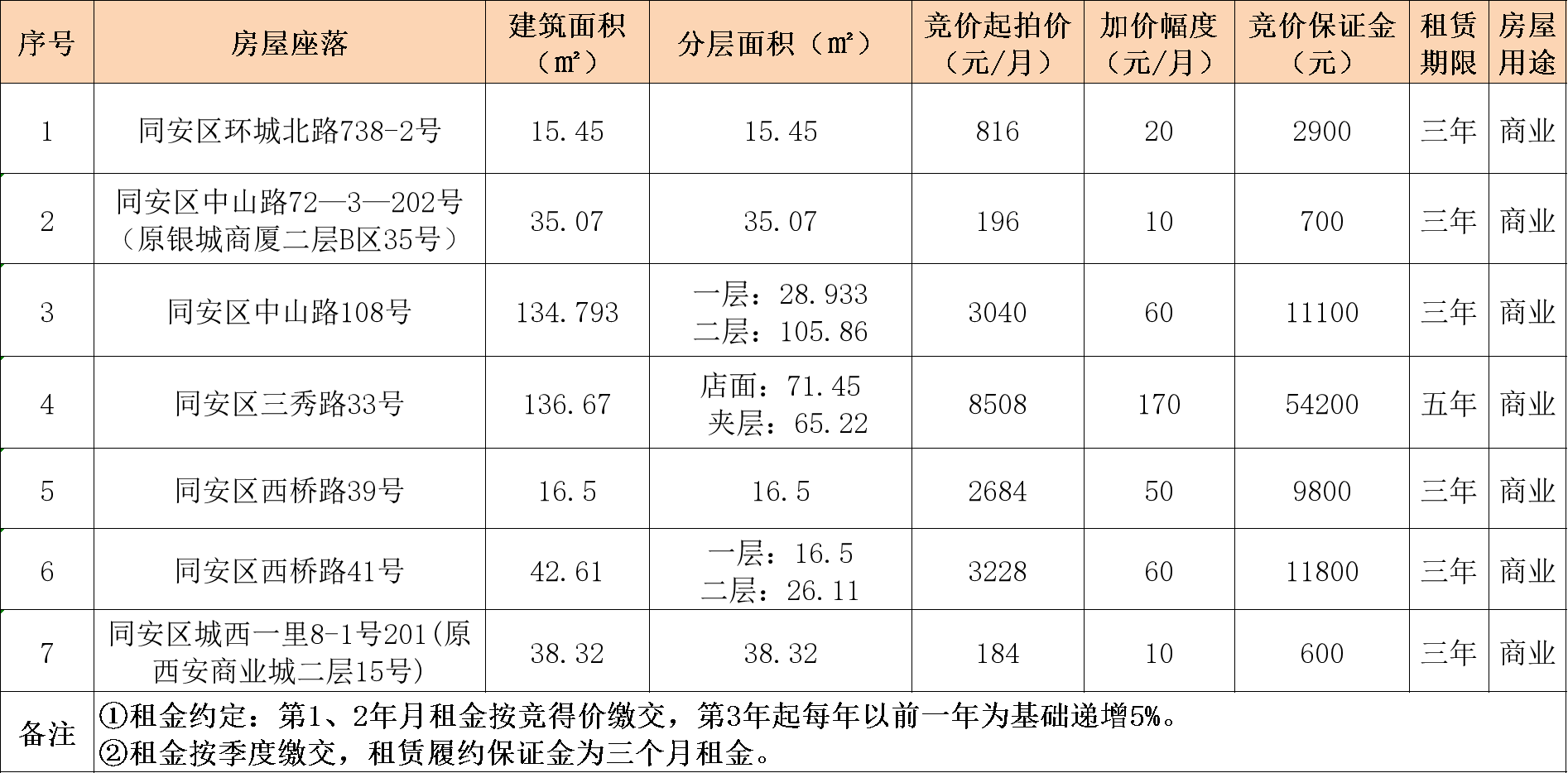 受委托,我公司于2026年4月24日10:30起在厦门市资产资源交易系统(网址:/index.html)采用网络竞价方式对“同安城投公司代管17宗房产3-5年租赁权招租(本次招租共7个标的)”项目公开招租,招租标的如下: