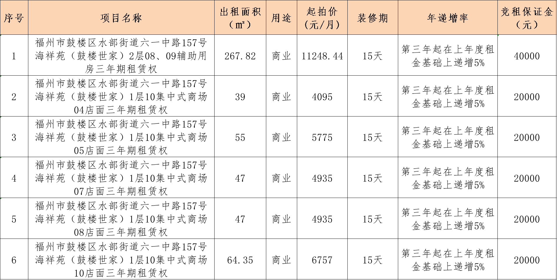 兹定于2025年11月20日(星期四)下午16时在中拍平台(https://paimai.caa123.org.cn/)举行房地产租赁权拍卖会。拍卖标的:福州市鼓楼区水部街道六一中路157号海祥苑(鼓楼世家)2层08、09辅助用房及1层10集中式商场04、05、07、08、10店面的三年期租赁权,以上六项标的逐项拍卖,标的具体信息详见以下清单。