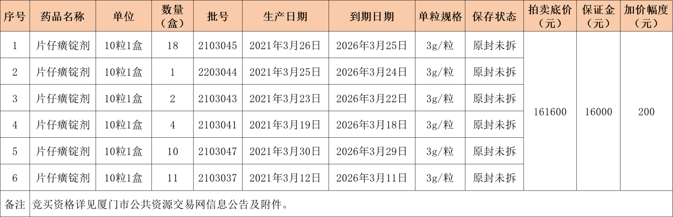 460粒罚没片仔癀锭剂(整体拍卖)拍卖公告
