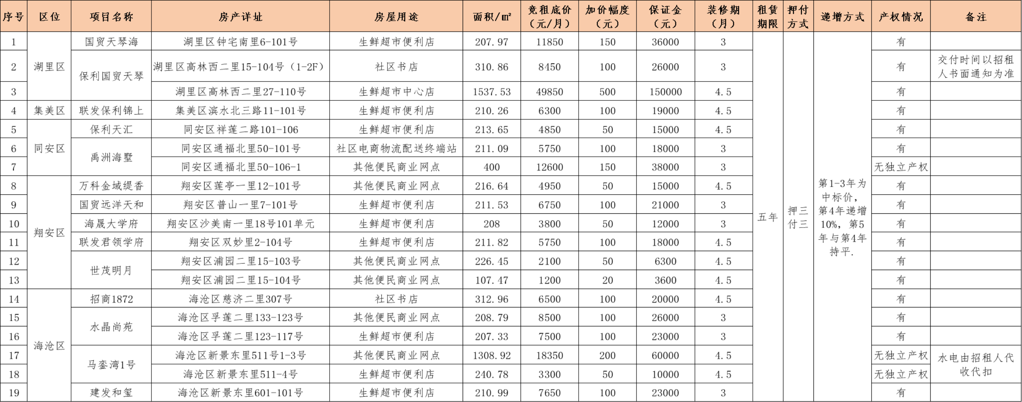 3、月竞租底价及增价幅度、缴交方式:详见标的清单,月竞租底价不含物业费、公维金、水电等其他费用(以物业公司收费标准),押三付三。